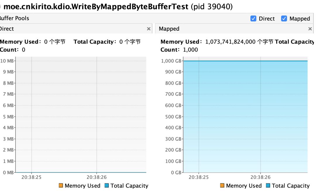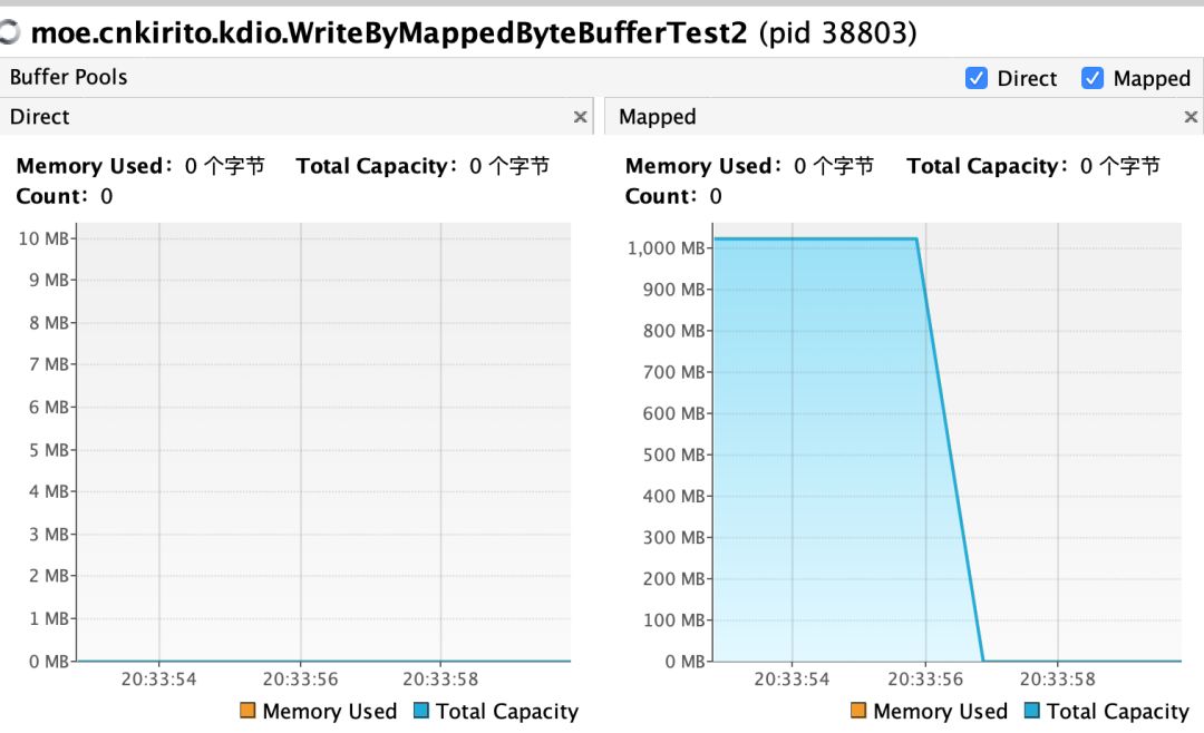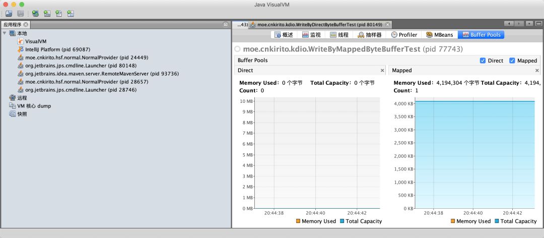 结论:MappedByteBuffer 映射出一片文件内容之后,不会全部加载到内存中,而是会进行一部分的预读(体现在占用的那 100M 上),MappedByteBuffer 不是文件读写的银弹,它仍然依赖于 PageCache 异步刷盘的机制。通过 Java VisualVM 可以监控到 mmap 总映射的大小,但并不是实际占用的内存量。
