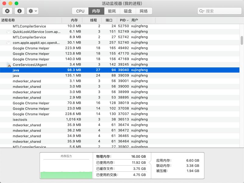 几乎在瞬间,控制台打印出了 map finish 的日志,也意味着 1000G 的内存映射几乎是不耗费时间的,为什么要做这个测试?就是为了解释内存映射并不等于内存占用,很多文章认为内存映射这种方式可以大幅度提升文件的读写速度,并宣称“写 MappedByteBuffer 就等于写内存”,实际是非常错误的认知。通过控制面板可以查看到该 Java 进程(pid 39040)实际占用的内存,仅仅不到 100M。(关于 Mmap 的使用场景和方式可以参考我之前的文章)