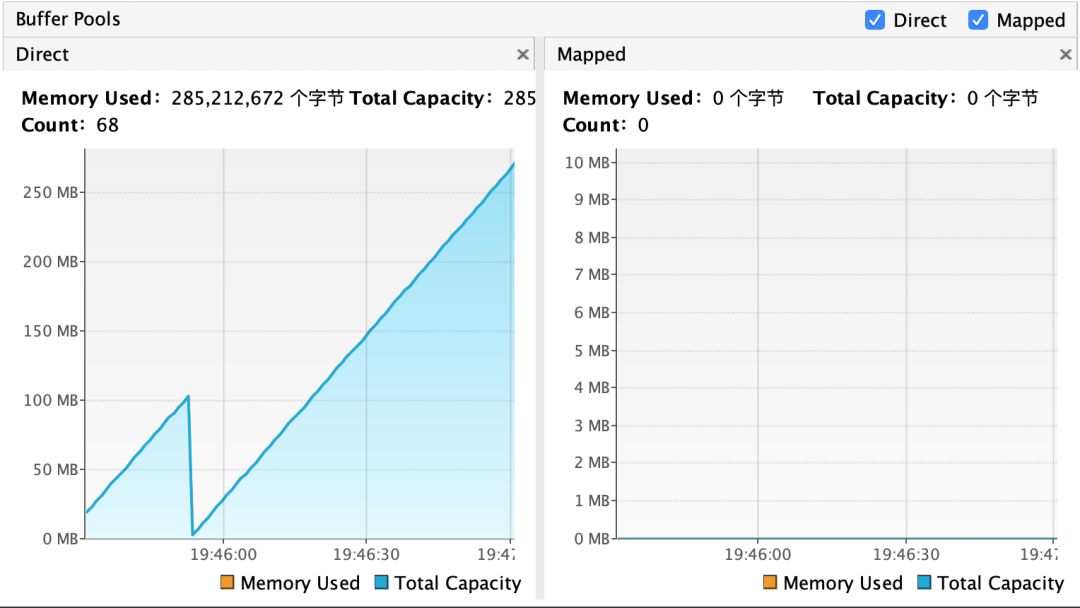 Buffer Pools 插件可以监控堆外内存(包含 DirectByteBuffer 和 MappedByteBuffer),如下图所示: