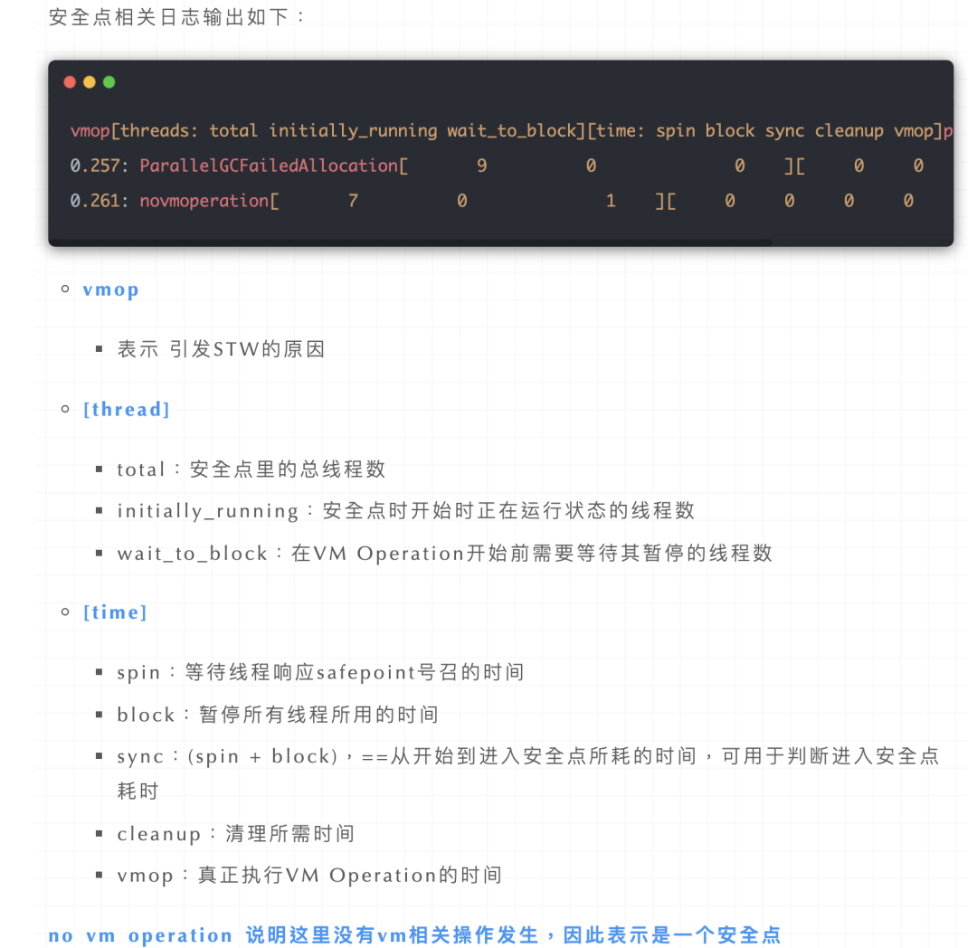因此,GC时,程序需要运行到最近的一个安全点(方法返回、循环结束、异常抛出等位置)停下来,安全点日志前面文章也提到了:如果发现 spin时间段表现异常,那么就要去查看下我们的代码中是否有影响线程快速到达安全点的逻辑块,比如大循环体等。