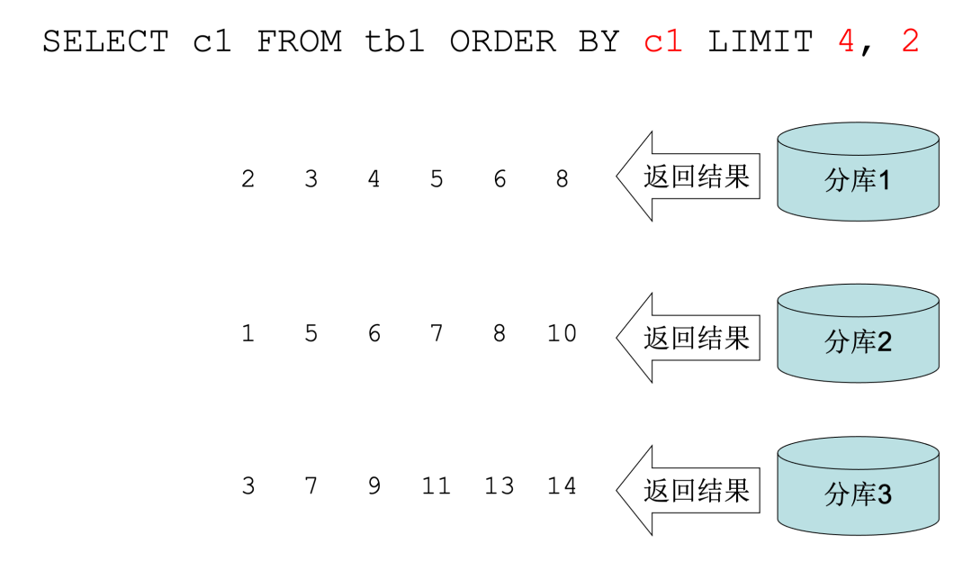 如果我们要查询 tb1 表的 c1 字段,且取 c1 正序的下标(从0开始)为4、5的数据。假设分了三个库,我们为了取到正确数据,需要去这三个分库都取下标0-5的数据,假设取到如下数据: