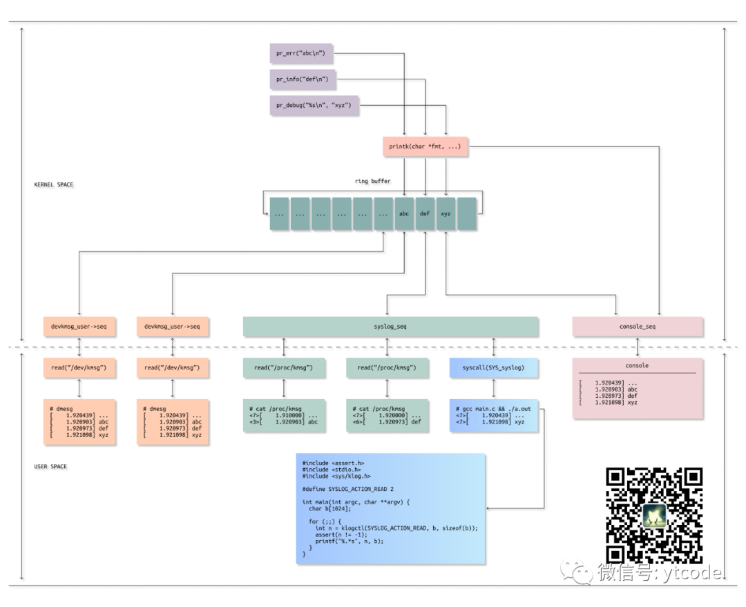 在用户态,我们有几个方式,可以查看printk输出的内核日志,比如使用dmesg命令,cat /proc/kmsg文件,或者是使用klogctl函数等,这些方式分别对应于全景图中用户态的橙色、绿色、和蓝色的部分。