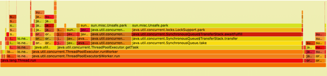 比如 uber 开源的 uber-common/jvm-profiler,它就是基于采样的 Cpu profiler,缺点就是存在 SafePoint Bias 问题,比如有一次排查一个 Cpu 占用问题,就采集到了这样的火焰图,可以看到几乎没啥用
