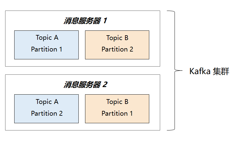 假设现在有两个 Topic,每个 Topic 都设置了两个 Partition,如果 Kafka 集群是两台机器,部署架构将会是下面这样: