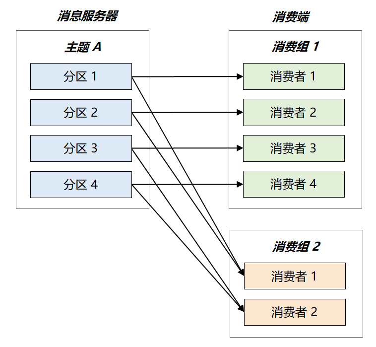 最终的消费关系如下图所示:假设主题 A 共有 4 个分区,消费组 2 只有两个消费者,最终这两个消费组将平分整个负载,各自消费两个分区的消息。