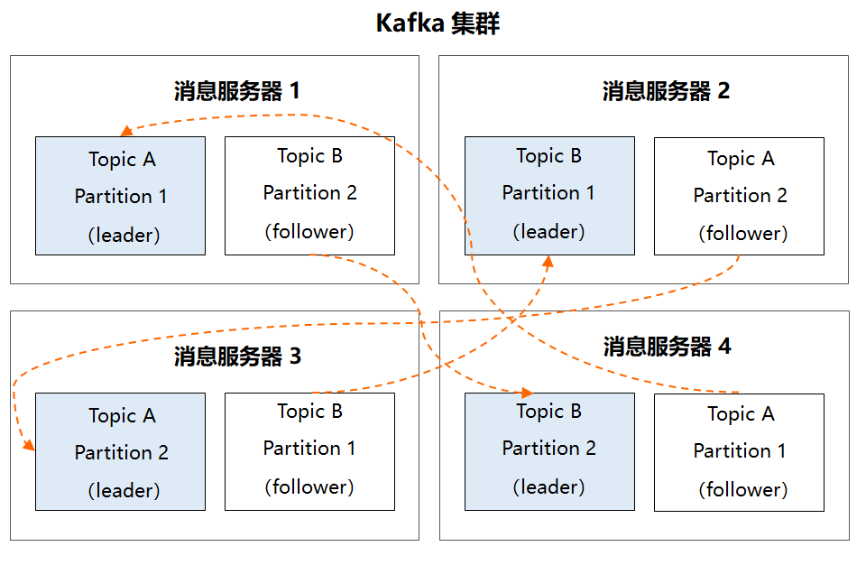 现在,我假设 Kafka 集群中有 4 台服务器,主题 A 和主题 B 都有两个 Partition,且每个 Partition 各有两个副本,那最终的多副本架构将如下图所示: