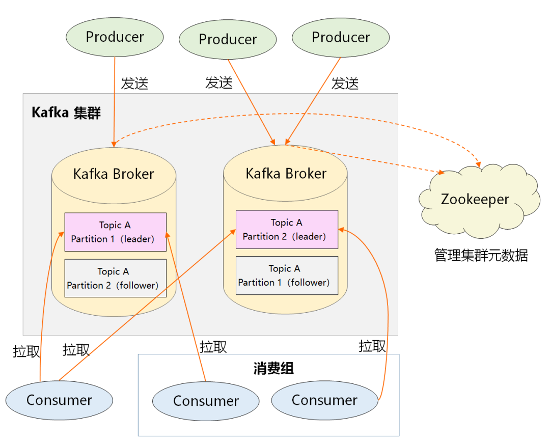 4、Zookeeper:负责集群的元数据管理等功能,比如集群中有哪些 broker 节点以及 Topic,每个 Topic 又有哪些 Partition 等。