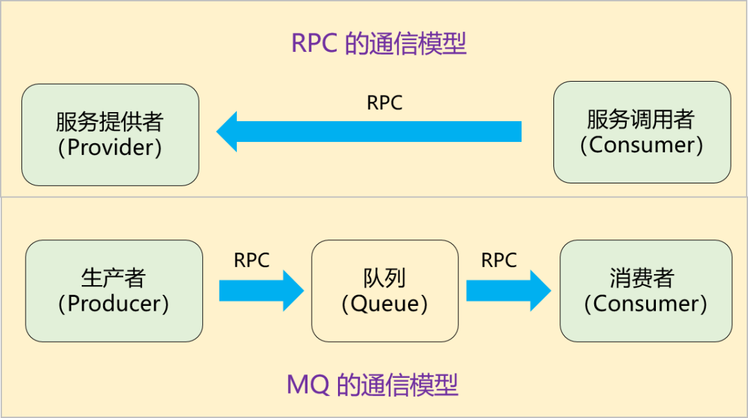 我们试着重新理解下消息队列的模型。它其实解决的是:生产者和消费者的通信问题。那它对比 RPC 有什么联系和区别呢?