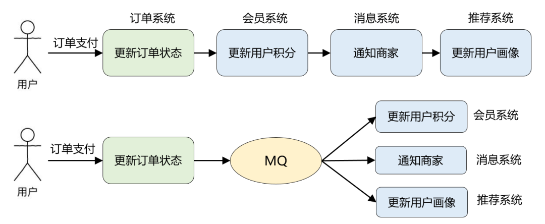 举一个实际例子,比如说电商业务中最常见的订单支付」场景:在订单支付成功后,需要更新订单状态、更新用户积分、通知商家有新订单、更新推荐系统中的用户画像等等。