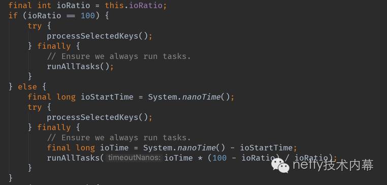 我们跳到else分支,processSelectionKeys()要做的事情就是IO操作(select),netty在处理io之前记录了一下io操作的开始时间,然后在io结束的时候计算了一下这段io操作花的总的时间ioTime,然后runAllTask方法表示花多长时间来处理一下netty内部的任务队列(cpu计算为主),在这里,netty传递的参数为ioTime * (100 - ioRatio) / ioRatio)。