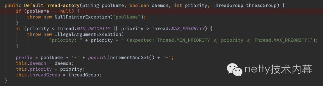 发现prefix的规则是poolName和poolId(自增)通过 ‘-‘ 连接起来的,那么接下来我们就要看看poolName在哪里初始化的,一个poolName对应一个EventLoopGroup,在EventLoopGroup的父类MultithreadEventLoopGroup中,我们找到了如下方法