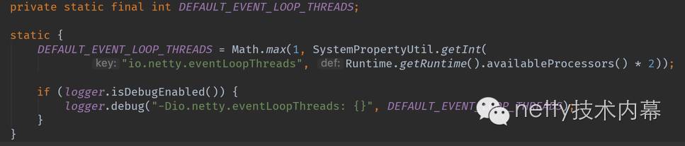 到了这里,我们基本可以暂停了,因为我们刚开始没有传参数,所以netty给我们默认传递了一个构造参数0,netty会判断线程个数是否为0,如果为0的话就是用默认的线程个数,而默认线程个数相关的代码如下