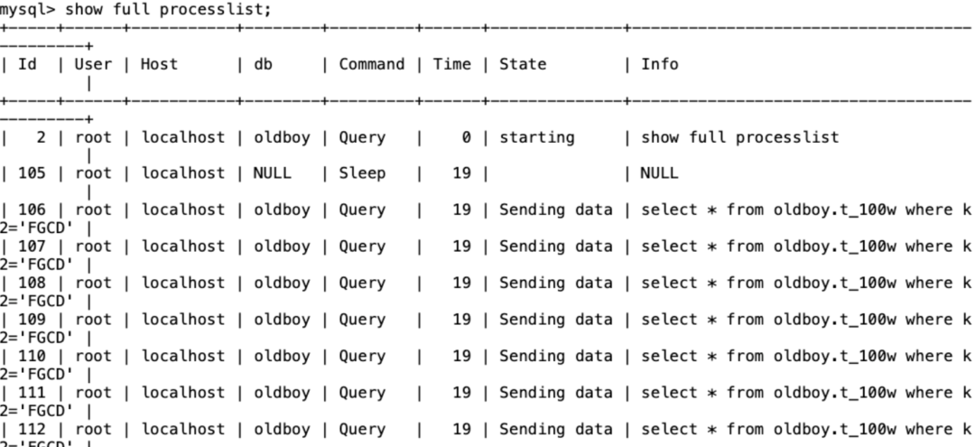 1 . 通过 show processlist; 或 show full processlist; 命令查看当前执行的查询,如下图所示: