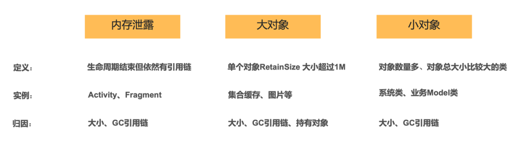 大对象:顾名思义就是比较大的对象,前面背景知识里说的 RetainSize 较大的对象,也就是释放掉之后总共可以回收的较大的对象。