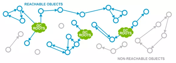 垃圾回收器当前主要通过可达性分析算法判断一个对象是否可以被回收:通过一系列称为GC Roots的对象作为起点,从这些节点开始向下搜索,搜索所走过的路径称为引用链,当一个对象到GC Roots没有任何引用链相连(即对象到GC Roots不可达),则证明此对象已死、可回收。下图灰色部分即为可回收的内存对象。