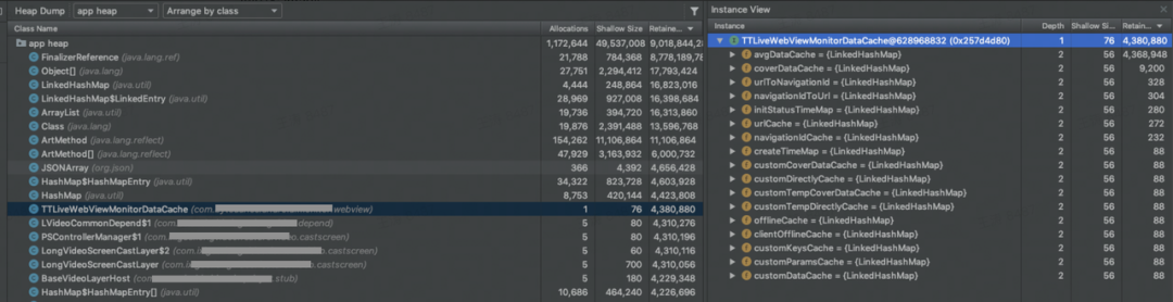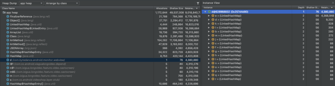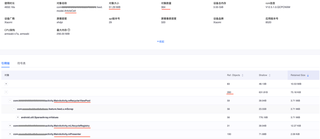 上面的case是说类ArticleCell的对象有364个,总Retained Size 是51.29M。其中280个被MainActivity所持有。所以如果要优化ArticleCell的内存占用,可以优化MainActivity里面的引用。