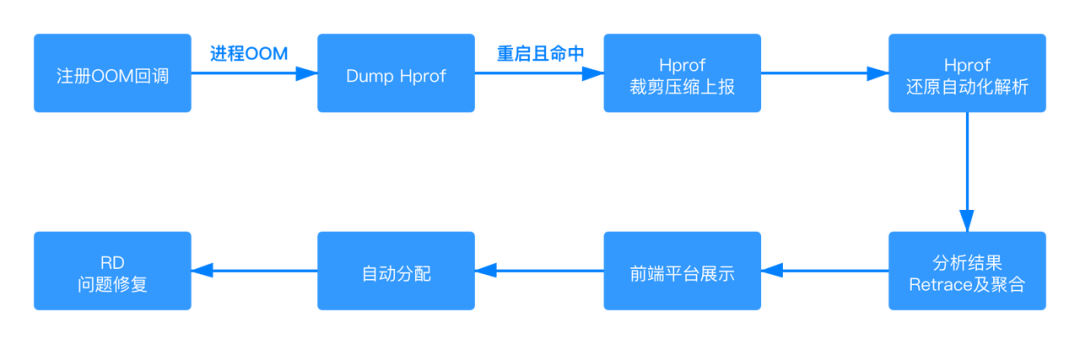 这个图比较清晰的介绍了方案的整个流程,业务方只需要接入SDK,就可以在平台查看核心内存问题,其他都是无感知的。