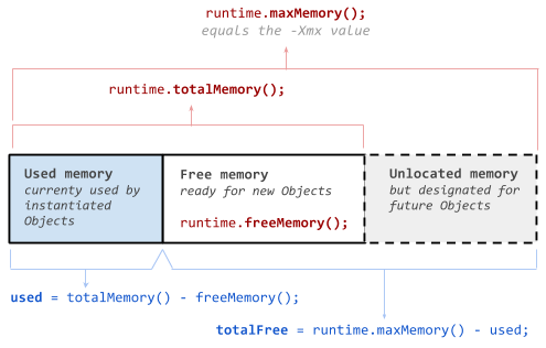 totalFree=maxMemory()-used:Java虚拟机还可以使用的部分