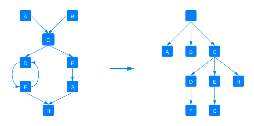 如上图,因为A和B都引用到C,所以A释放时,C内存不会被释放。所以C这块内存不会被计算到A或者B的Retained Size中,因此,对象树在转换成Dominator Tree时,会A、B、C三个是平级的。