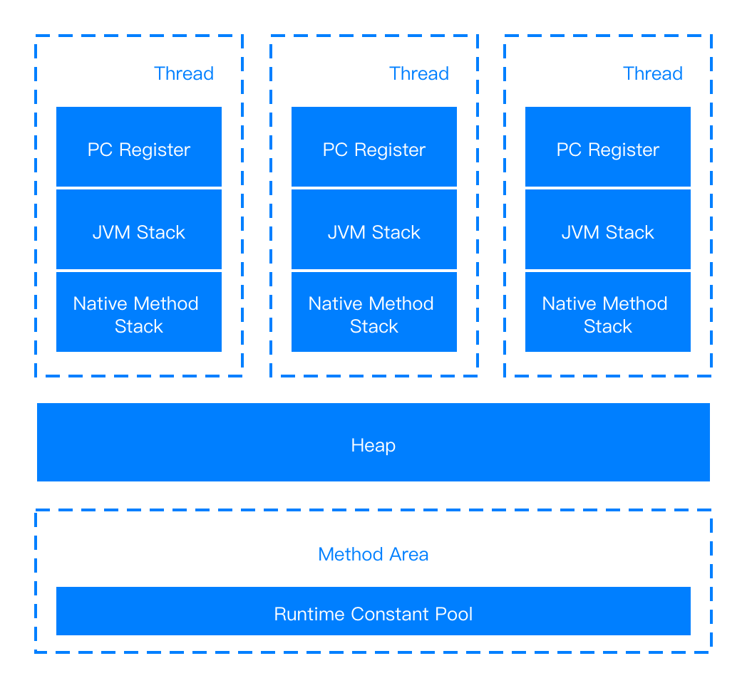 Java 虚拟机在执行 Java 程序的过程中会把它管理的内存划分成若干个不同的数据区域,如下图所示: