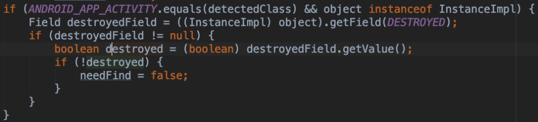通过分析 Activity 的源码发现Activity调用 onDestroy 之后一个变量的值会发生变化,通过这个变量我们可以判断 Activity 是不是走了 onDestroy,如果走了那说明这个 Activity 对象存在属于泄露,没有走则说明属于正常使用。