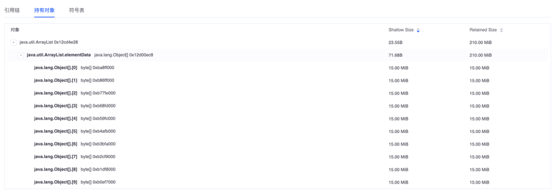 这里我们就知道了如果要优化内存或者解决泄露,优先关注 Retained Size 较大的对象,因为Retained Size大的对象所能释放的内存空间更大。