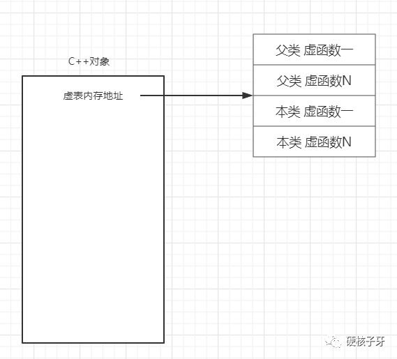 C++的虚表在哪呢?在new创建的对象的头部。虚表里面存储的是什么呢?是虚函数。C++这块的知识我就不讲太多了,很多小伙伴不了解C++,讲多了没必要,作为一名Java程序员,了解到这个程度够了。