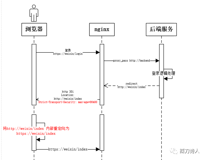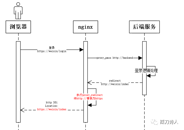 比如上面提到的proxy_redirect http:// https://,会在返回响应时将URL中的http替换为https,从而解决我们遇到的问题,同样贴个图帮助理解。