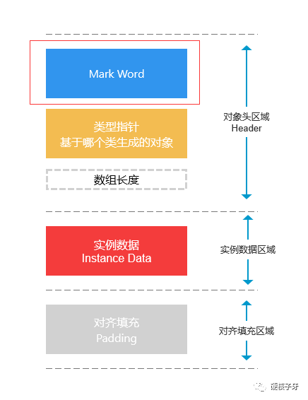 这些锁存储在哪个位置呢?对象头中。Java的每个对象,在JVM中的结构如图。Mark Word区域就是对象头。展开来就是上图的样子