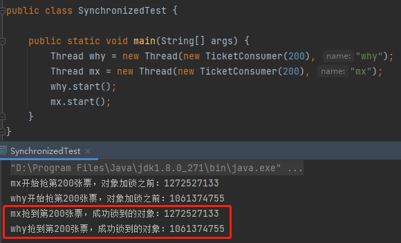System.out.println(Thread.currentThread().getName() + "抢到第" + ticket + "张票,成功锁到的对象:" + System.identityHashCode(ticket));