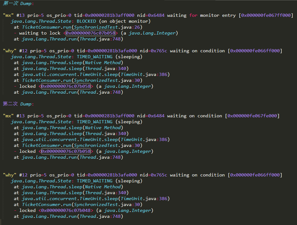 从 Dump 信息看,两个线程竞争的是同一把锁,所以第一次没毛病。
