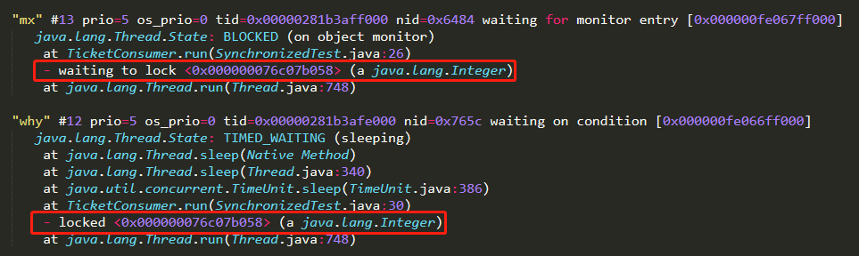 同时,从线程堆栈中我们也能看出来为什么锁对象 System.identityHashCode 的输出是一样的。
