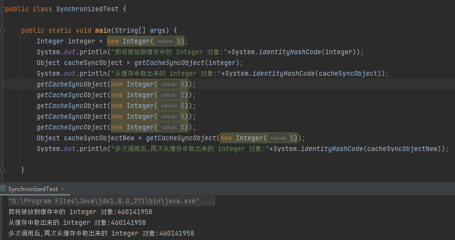 因此,你可以传递任何数量的 "new Integer(5)" 的不同 Integer 实例作为 getCacheSyncObject 的参数,但是你将永远只能得到传递进来的包含该值的第一个实例。