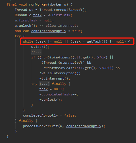 同时它也实现了 Runnable 方法,所以说到底它就是一个被封装起来的线程,用来运行提交到线程池里面的任务,当没有任务的时候就去队列里面 take 或者 poll 等着,命不好的就被回收了。