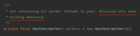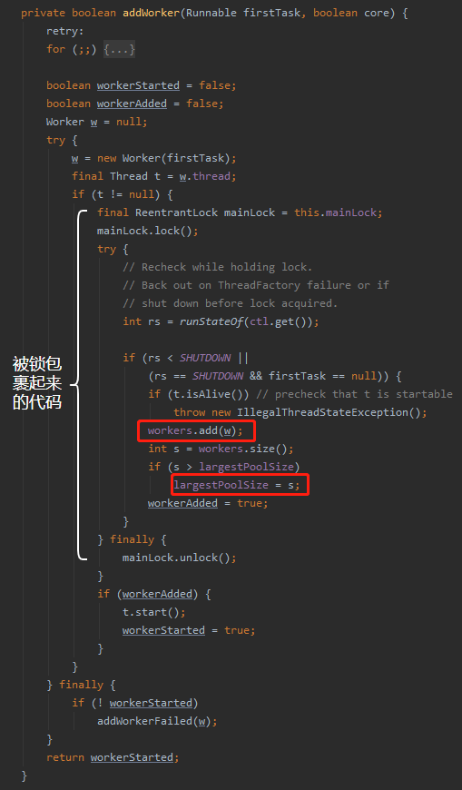 所以你就按照这个思路分析,addWorker 中被锁包裹起来的这段代码,它到底在独占什么东西?