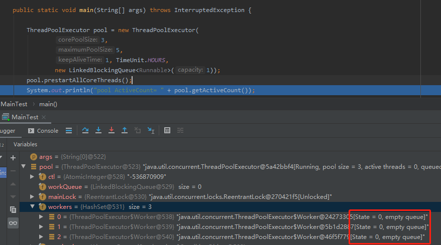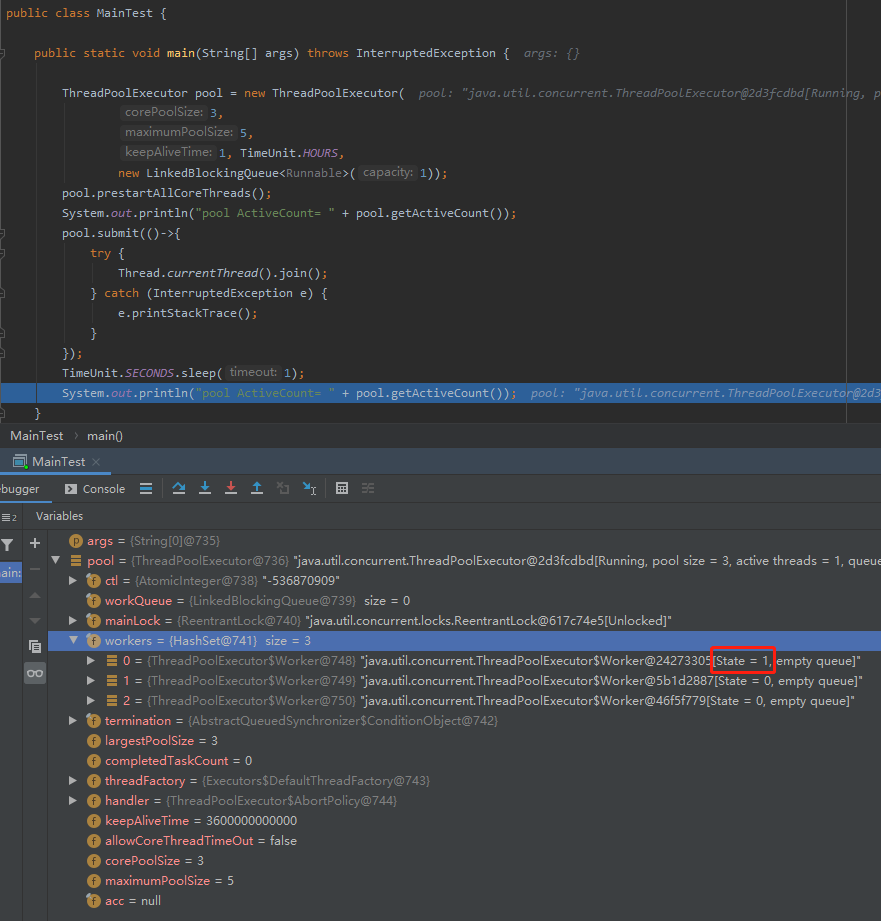 加上阻塞,程序是能感知到 largestPoolSize 有可能正在发生变化,所以获取到的一定是 addWorker 方法执行完成后的 largestPoolSize。