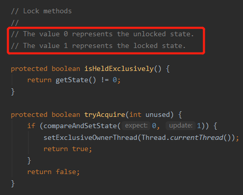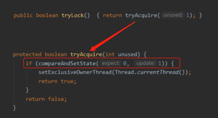 核心逻辑就是一个 CAS 操作,把某个状态从 0 更新为 1,如果成功了,就是 tryLock 成功。