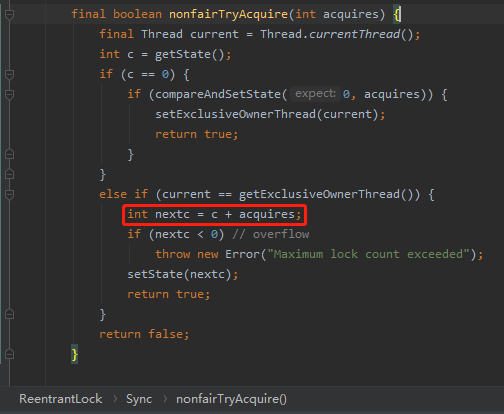 如果你还没反应过来是怎么回事的话,我给你看一下 ReentrantLock 里面的重入逻辑: