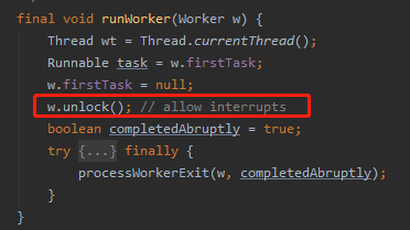 所以你去看 runWorker,你就知道为什么这里上来先进行一个 unLock 操作,后面跟着一个 allow interrupts 的注释: