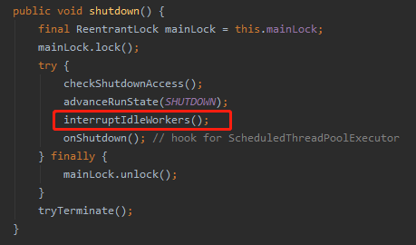 因为 shutdown 方法调用了 interruptIdleWorkers: