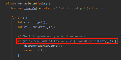 getTask 方法里面会先判断线程池状态,这个时候就能感知到线程池关闭了,返回 null,这个 worker 也就默默的退出了。