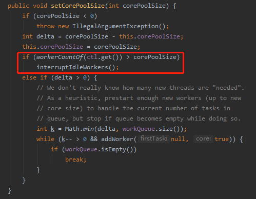 说明当前的 worker 的数量是多余我要重新设置的 corePoolSize,需要减少一点。