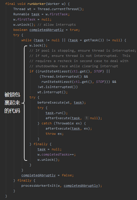 这里是线程池里面的线程,正在执行提交的任务的逻辑的地方,为什么需要加锁呢?