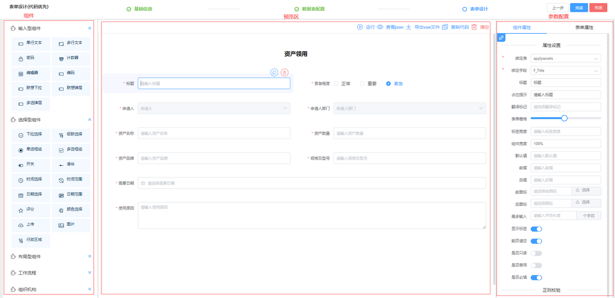 可视化表单:通常由多型拖拽式组件,预览区(编辑区)和参数配置模块组成,整体简洁美观,符合操作习惯即可。