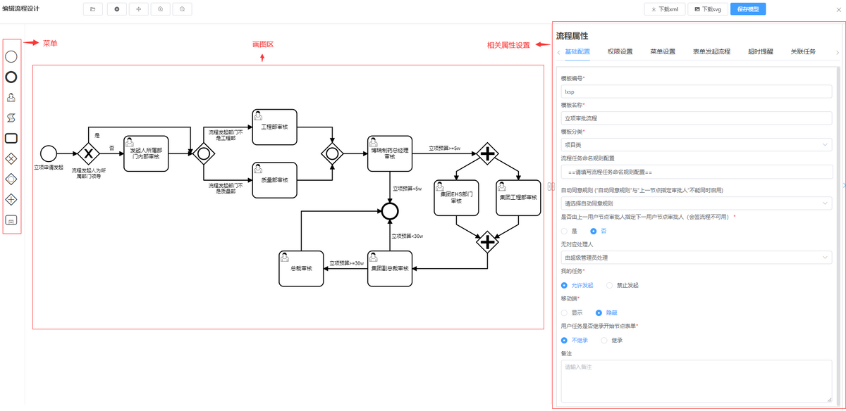 可视化流程:流程是一个系统的基础,通常由流程菜单、画图、权限、流向逻辑配置等模块组成,各模块分开布局,通过参数设置来关联业务。