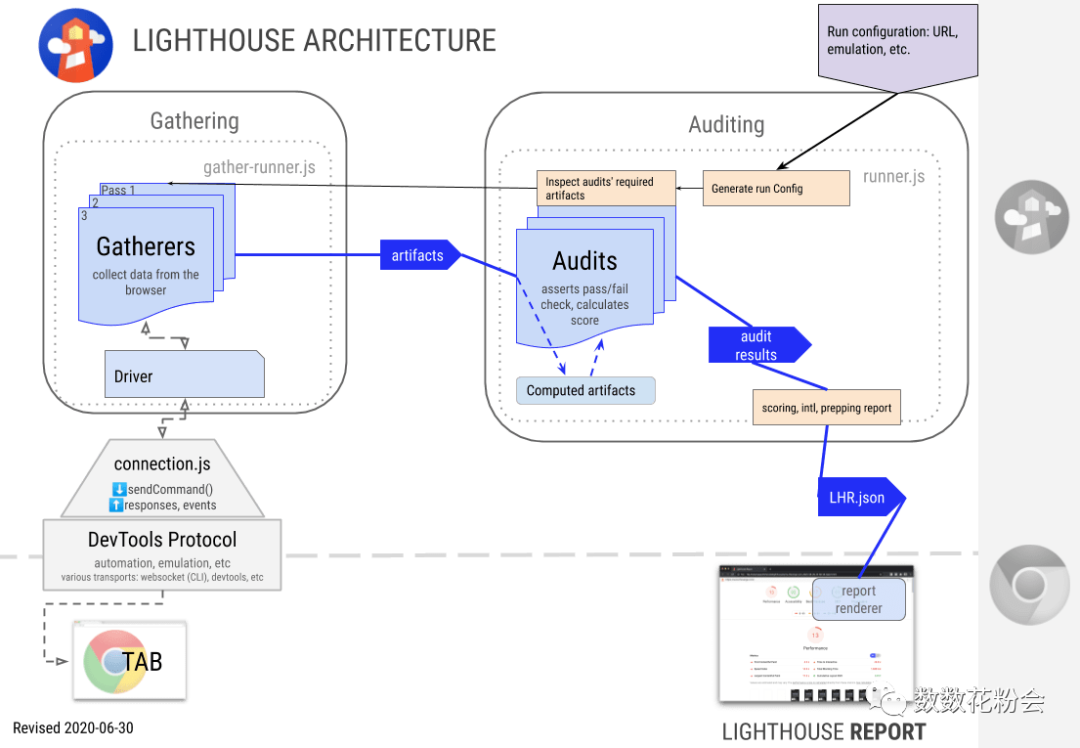 简单来说 Lighthouse 的工作流程就是:指定页面 —> 连接页面 —> 测试页面 —> 生成报告。
