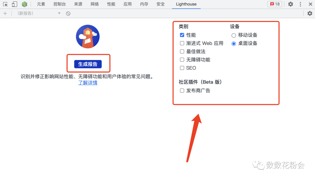 1. 在工具栏后,选择 Lighthouse 选项卡。
