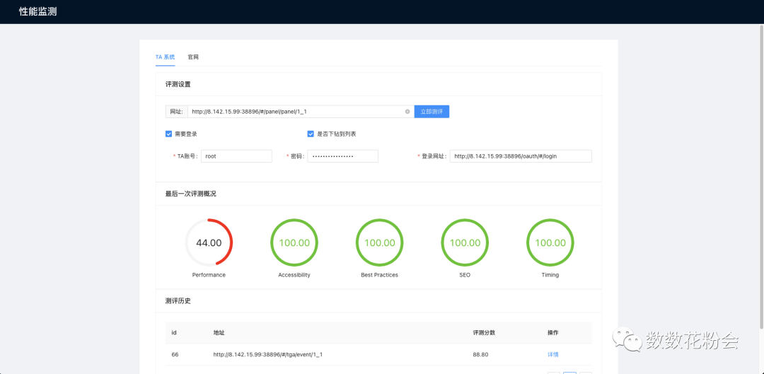 目前数数前端小组已经完成了自研的前端性能监控平台 1.0 版的开发,涉及到的技术有 react、node.js、egg、mysql、Lighthouse、Puppeteer 等。其中 react 作为监控平台前端页面编写语言,egg 作为后台服务,mysql 作为数据库,Lighthouse、Puppeteer 均为 node 库,前者为性能指标采集审查工具,后者提供无头浏览器环境模拟页面操作。