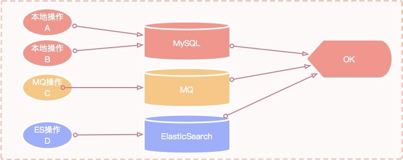 如上图,四个操作分散在三个不同的资源中。要想达到一致性,需要三个不同的资源进行统一协调。它们底层的协议,以及实现方式,都是不一样的。那就无法通过Spring提供的Transaction注解来解决,需要借助外部的组件来完成。
