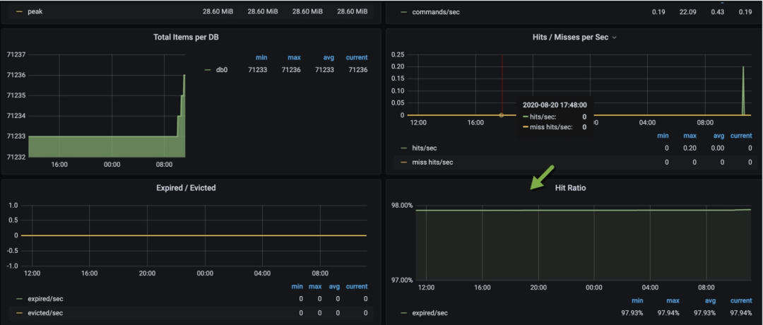 如图,我们通常使用Grafana进行监控数据的展示,使用AlertManager组件进行提前预警。这一部分的搭建工作不是我们的重点,感兴趣的同学可自行研究。下图便是一张典型的监控图,可以看到Redis的缓存命中率等情况。